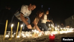 Память погибших почтили минутой молчания. Укрывая ладонью пламя свечей от неожиданно налетевшего ветра, люди не расходились и тихо молились за упокой жертв августовской войны.