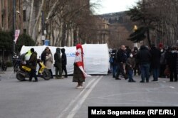 Одну из палаток демонстранты установили на проезжей части проспекта Руставели. Вскоре сотрудники полиции указали им, что это противозаконно, после чего было принято решение перенести палатку на тротуар.