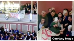 Выступление Каладзе сопровождалось сразу несколькими инцидентами. Сначала гражданским активистам, находившимся на заседании, охранники и сторонники мэра не дали возможности раскрыть плакат с надписью «коррупция убивает».