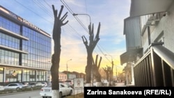 Аза: Я не знаю, как правильно осуществляется обрубка деревьев, но к профессиональной обрубке деревьев отношусь положительно. Вот сейчас эти три дерева, которые оставили необрубленными, они постоянно засоряют нам крышу. Посмотрите наверх. Это все собирается по водосточным трубам, они засоряются, вода течет по стенам, стены рушатся. Все надо делать качественно. Не знаю, почему эти три дерева оставили. Я положительно отношусь, но только к профессиональной обрубке. Я не знаю, какая это – профессиональная или непрофессиональная обрубка. Кроме того, много аллергиков. Зелени должно быть много, это первым делом кислород. Вот здесь во дворе росли вековые ели, их срубили и построили магазин. Прямо под носом городской администрации. Вот их как раз рубить не надо было. Их срубили частные лица, чтобы построить магазин. Вам это как? Это кислород, тень. Во всем мире ищут источники кислорода, а мы их срубаем. Надо делать это как-то аккуратнее.