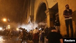 В ведомстве заявляют, что участники митинга вели себя агрессивно и пытались повредить входные железные двери парламента.