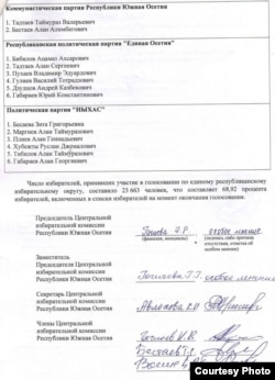 В качестве доказательства тому, что Центризбирком принял решение под давлением, оппозиционный телеграм-канал «Чъребайы Хъæргæнæг» опубликовал снимки итогового протокола по распределению мандатов между партиями. Из пятнадцати членов ЦИК Южной Осетии пятеро его не подписали, включая председателя Эмилию Гагиеву и зампредседателя Гултамзе Гогичаеву. Такое в истории югоосетинских выборов впервые, и, убеждены спикеры, нет сомнений, что члены избирательной комиссии находятся под давлением.